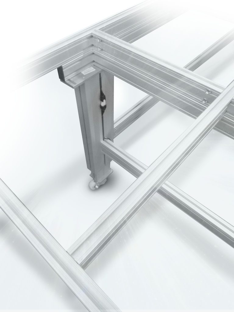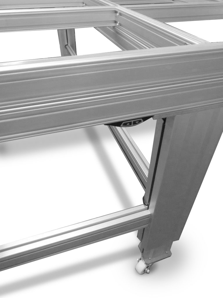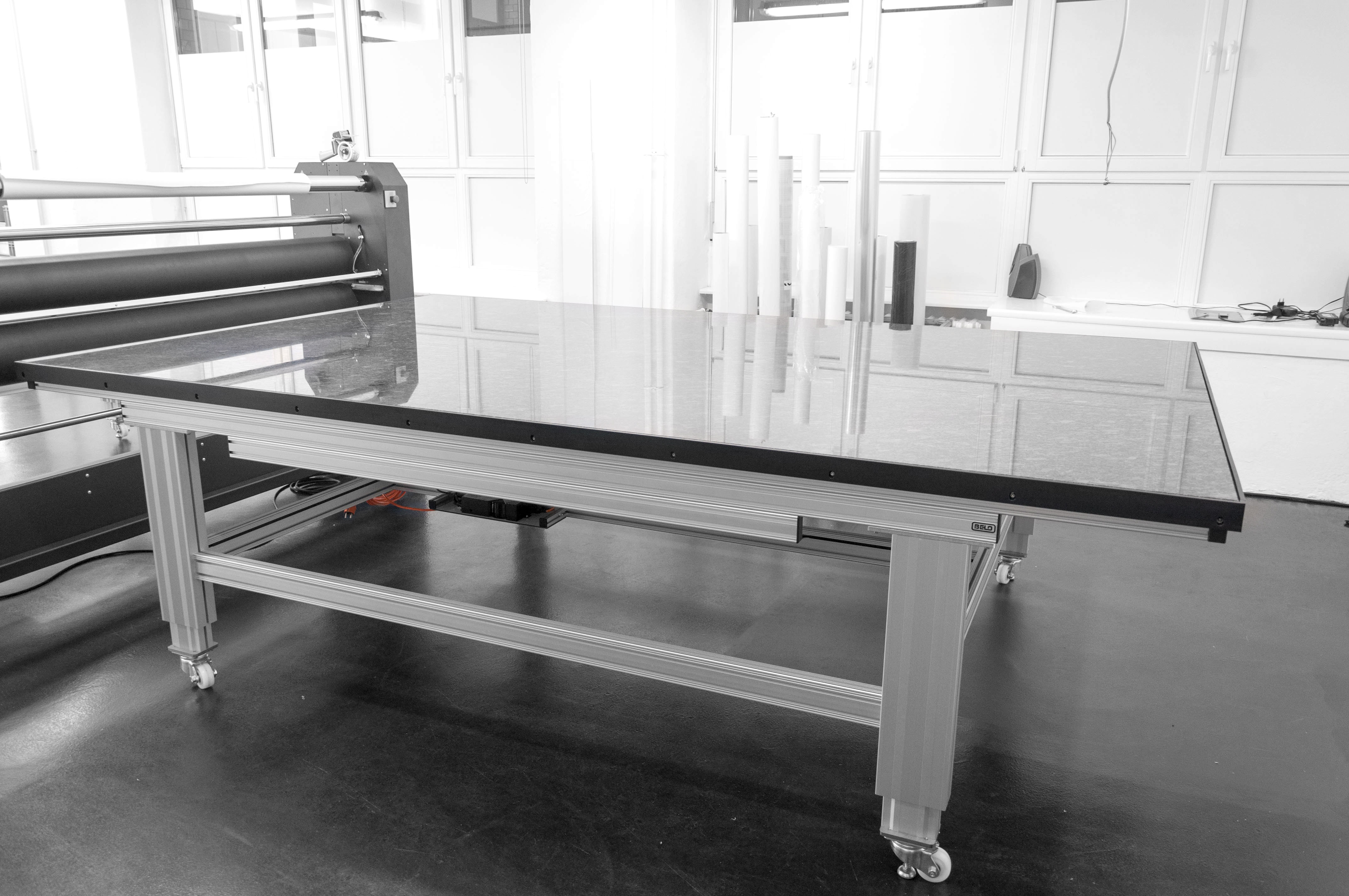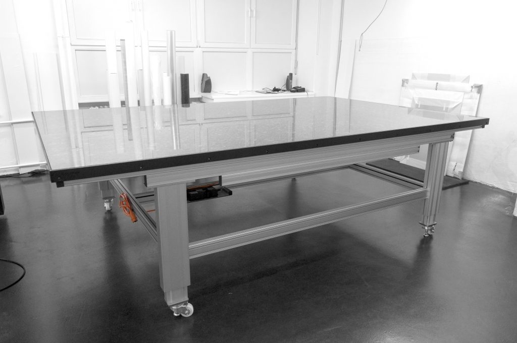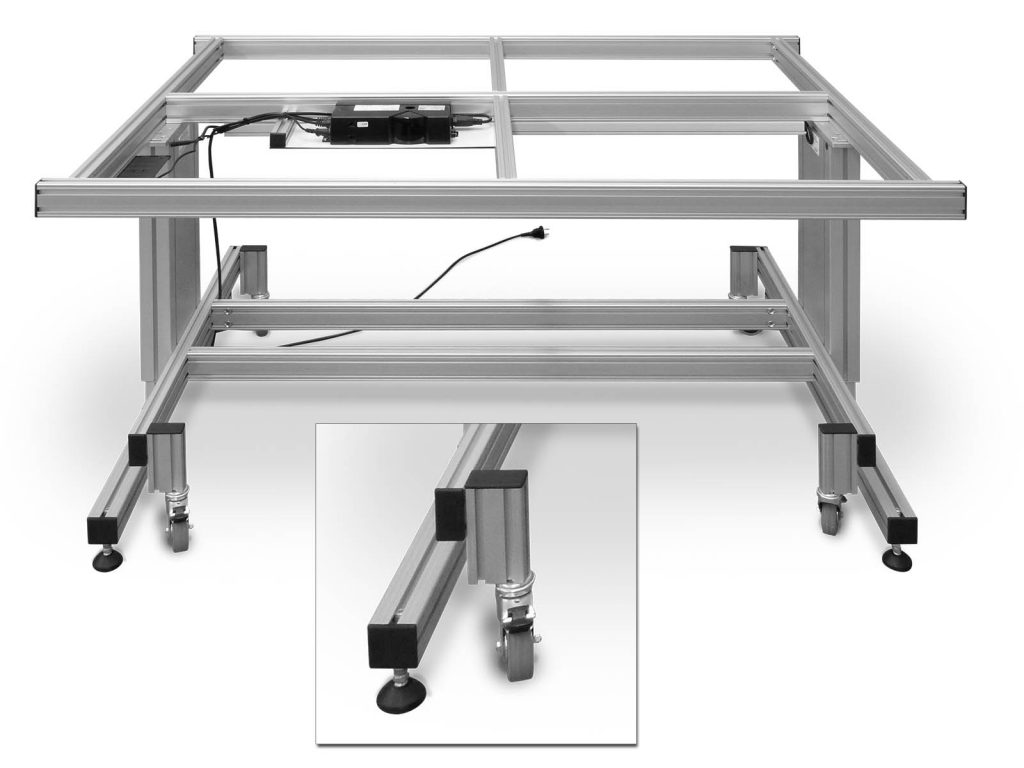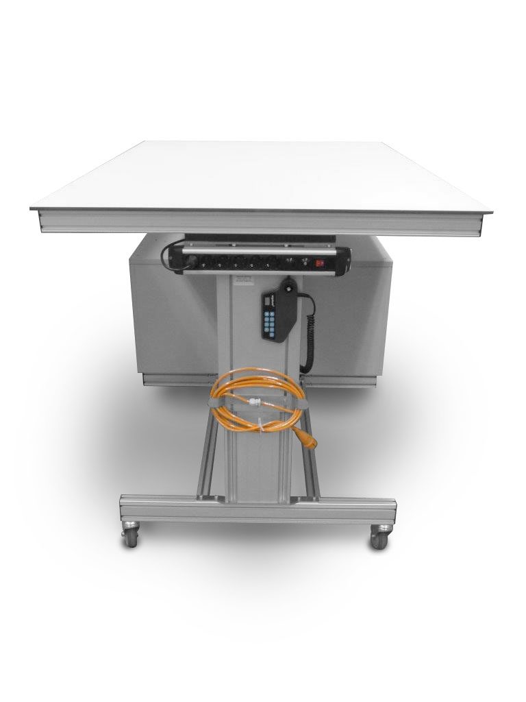 Die Tischbeine sind individuell höhenverstellbar, auf Rollen mit zusätzlichen Feststellfüßen. Elektromechanische Höhenverstellung mit Hubkraft insg. 1.000 Kg bei gleichmäßiger Kraftverteilung. Wahlweise wird vor Ort eine normale Arbeitsplatte (feuchtigkeits- und lösemittelbeständige Vollkunststoffplatte), Glasplatte oder Granitplatte aufgelegt.