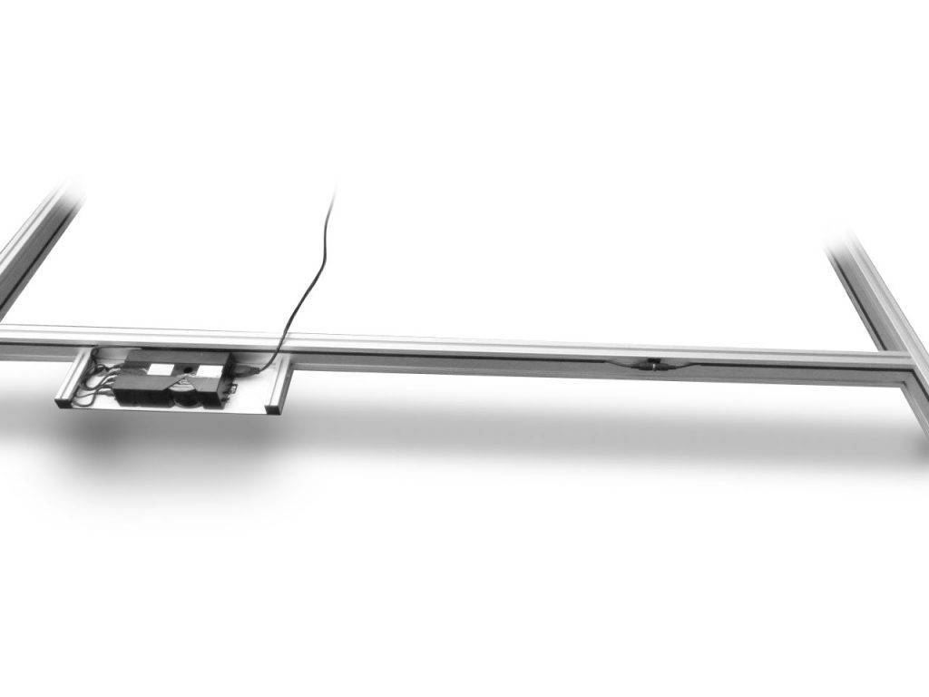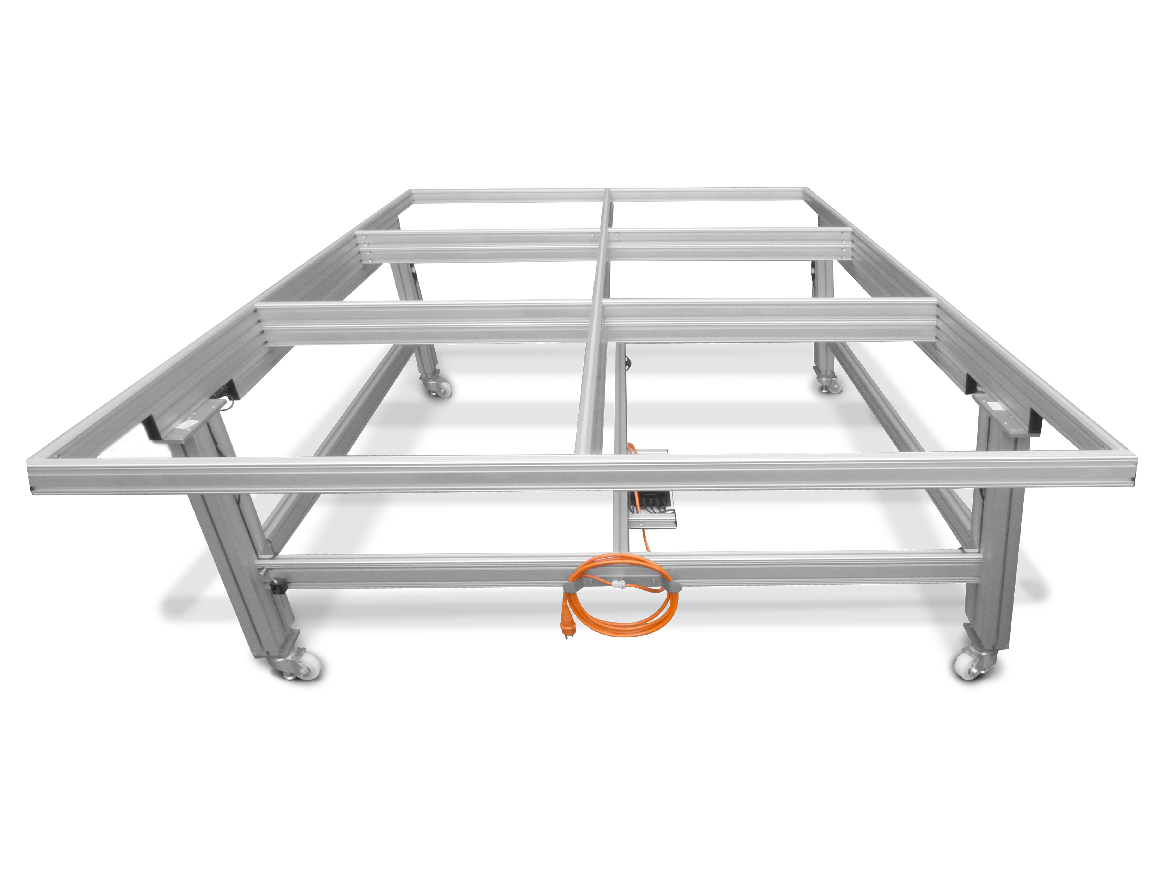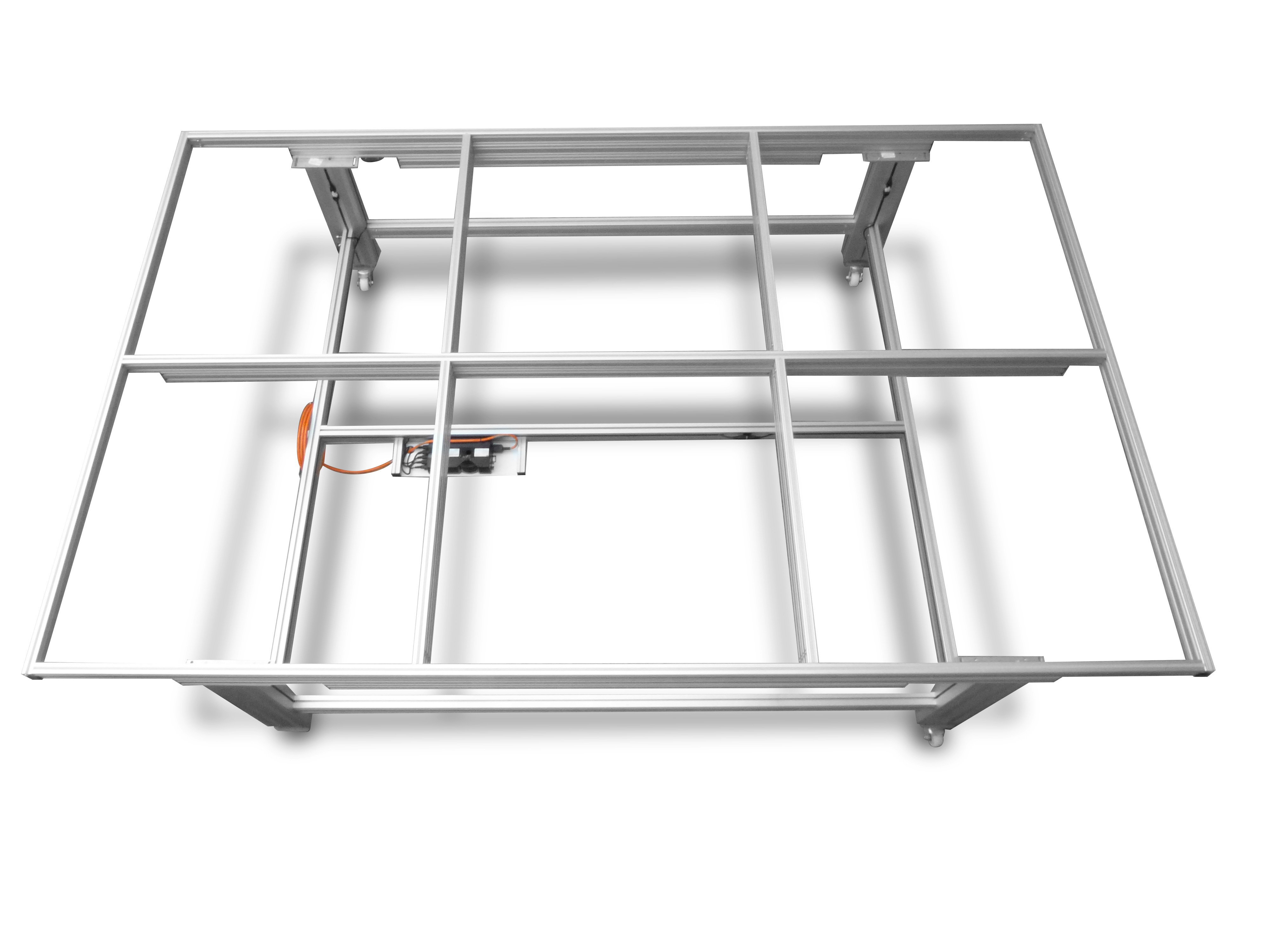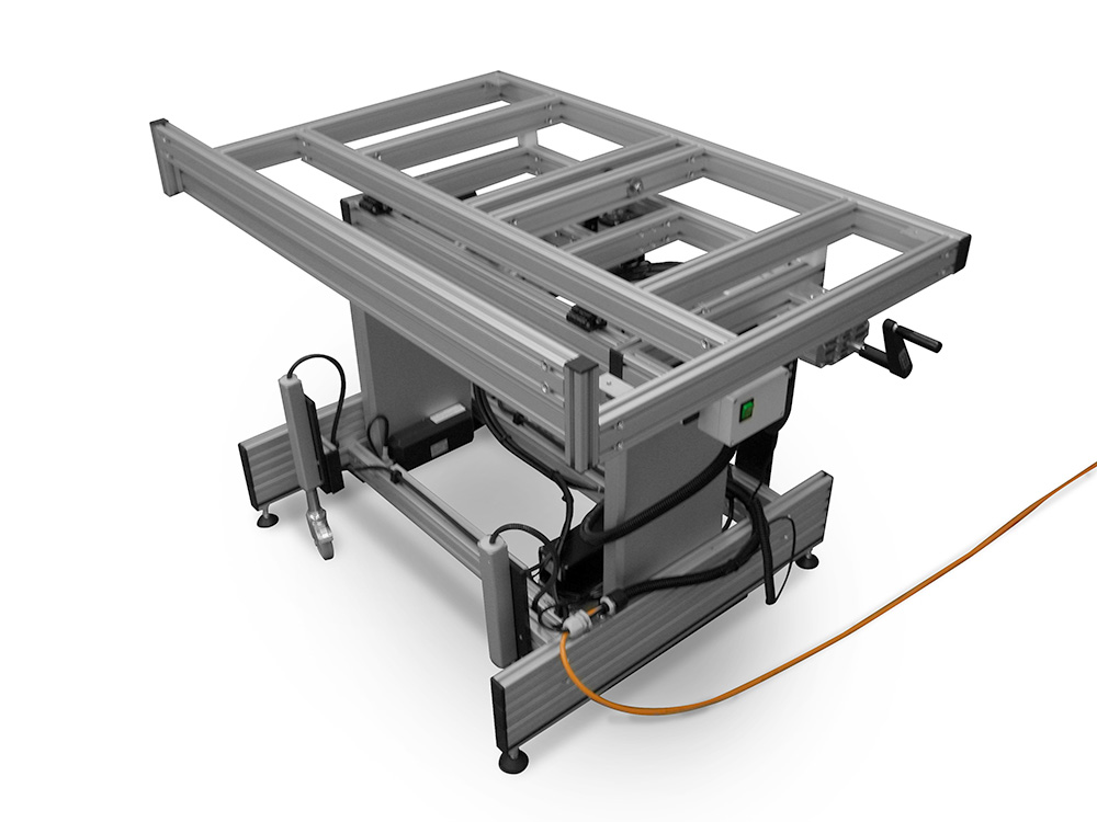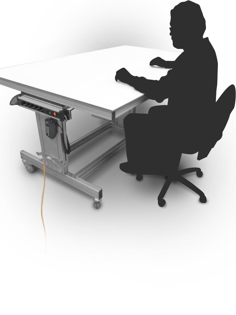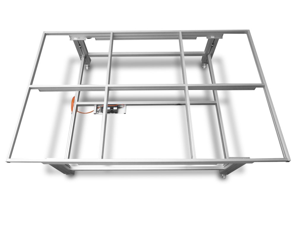 Die Tischbeine sind individuell höhenverstellbar, auf Rollen mit zusätzlichen Feststellfüßen. Elektromechanische Höhenverstellung mit Hubkraft insg. 1.000 Kg bei gleichmäßiger Kraftverteilung. Wahlweise wird vor Ort eine normale Arbeitsplatte (feuchtigkeits- und lösemittelbeständige Vollkunststoffplatte), Glasplatte oder Granitplatte aufgelegt.