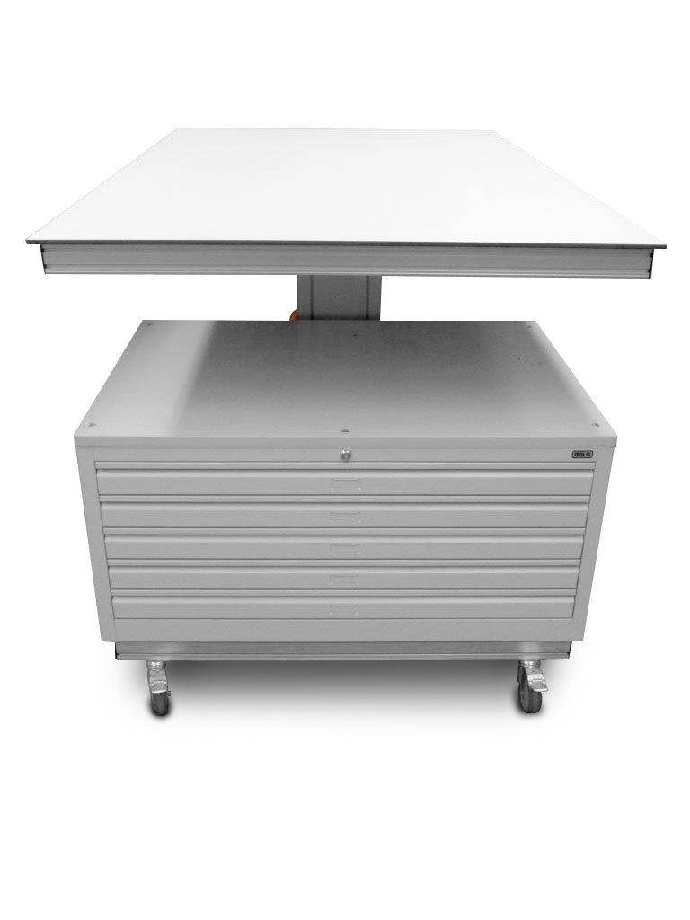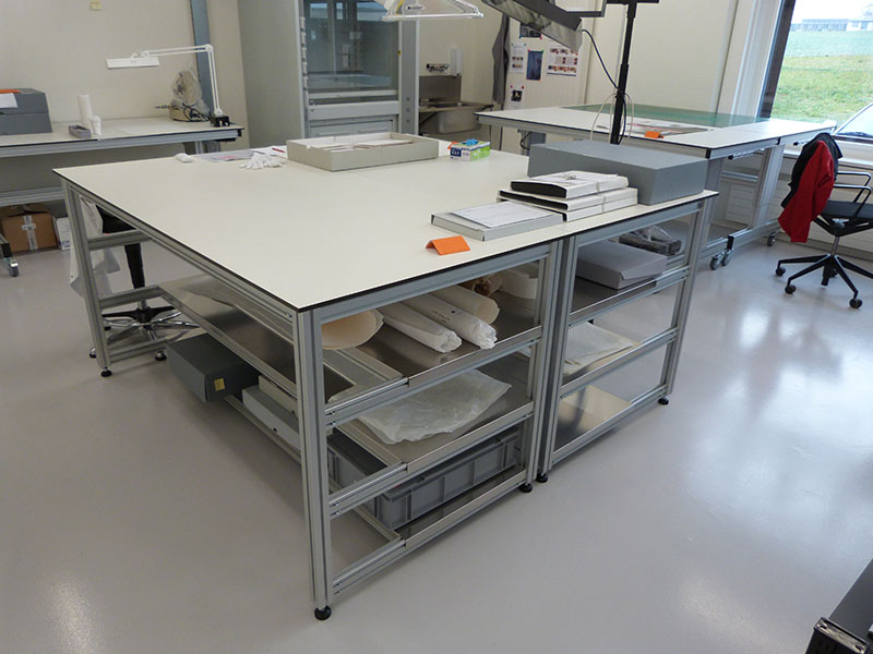 Auf Wunsch können diese Arbeitstische mit einer elektromechanischen Höhenverstellung ausgerüstet werden. Es ist ebenfalls möglich, die Tische mit einer Neigungsverstellung auszurüsten, bis hin zu einer kombinierten Arbeitstisch-Staffelei.