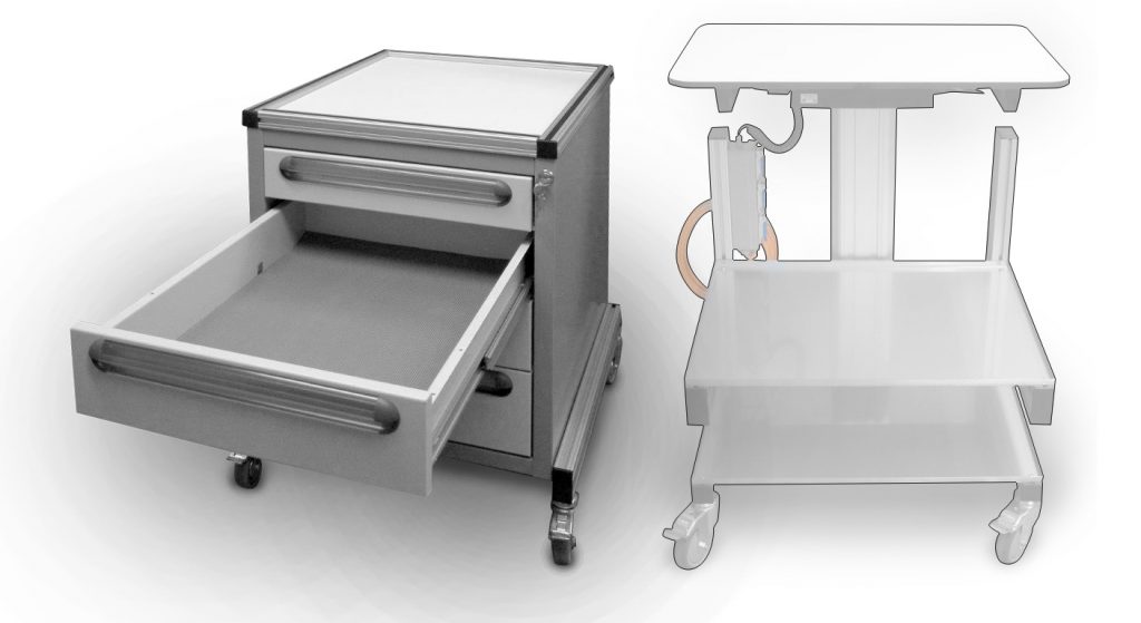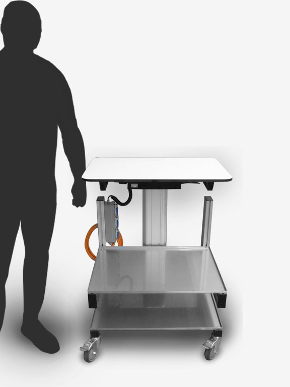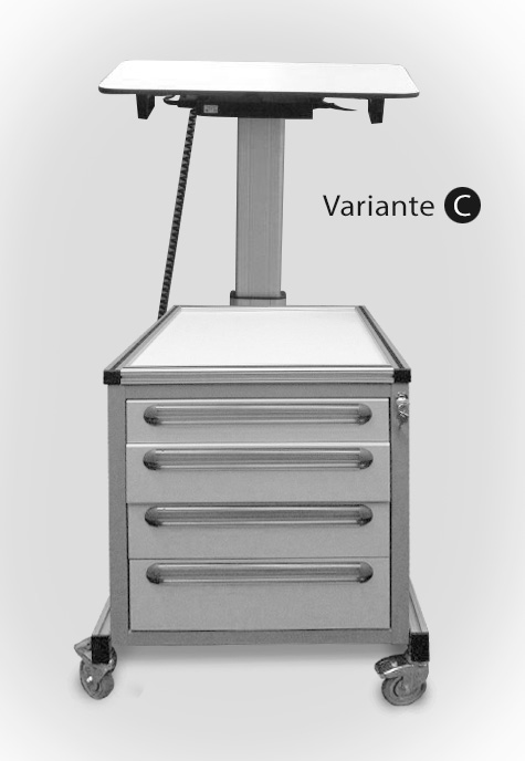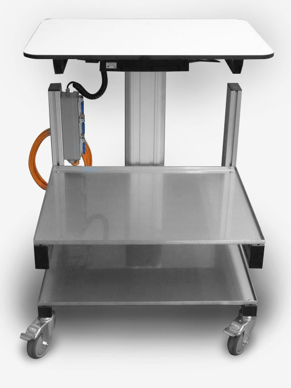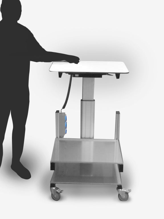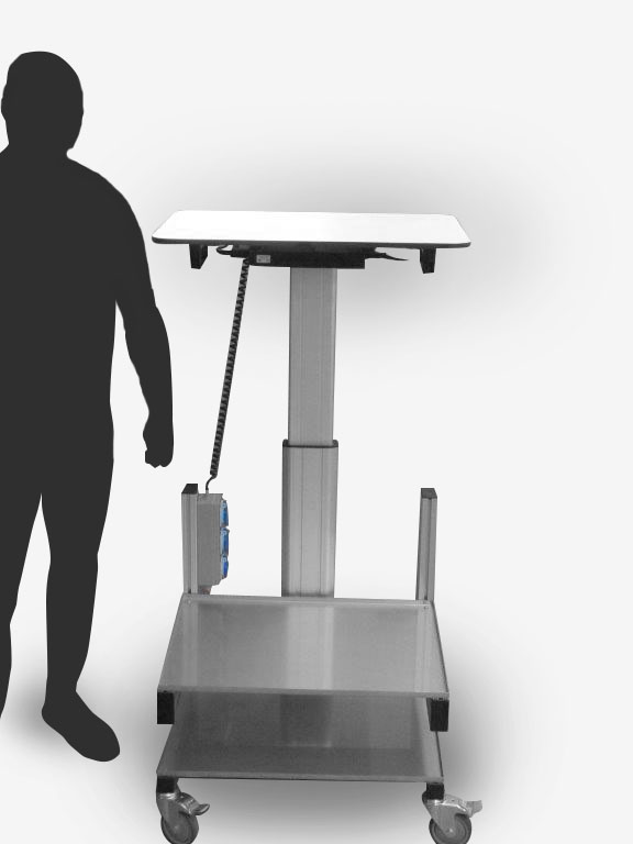 Individuell höhenverstellbarer PC-Arbeitsplatz auf Rollen mit zusätzlichen Feststellfüßen. Elektromechanische Höhenverstellung und spritzwasser-/staubgeschütze Stromverteilerdose.