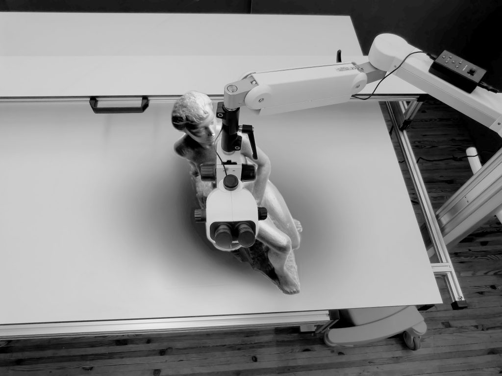 Der abgebildete BELO-Arbeitstisch ist unter die normale Arbeitstischhöhe absenkbar und ermöglicht bei dreidimensionalen Objekten ein entspanntes Arbeiten im Sitzen.