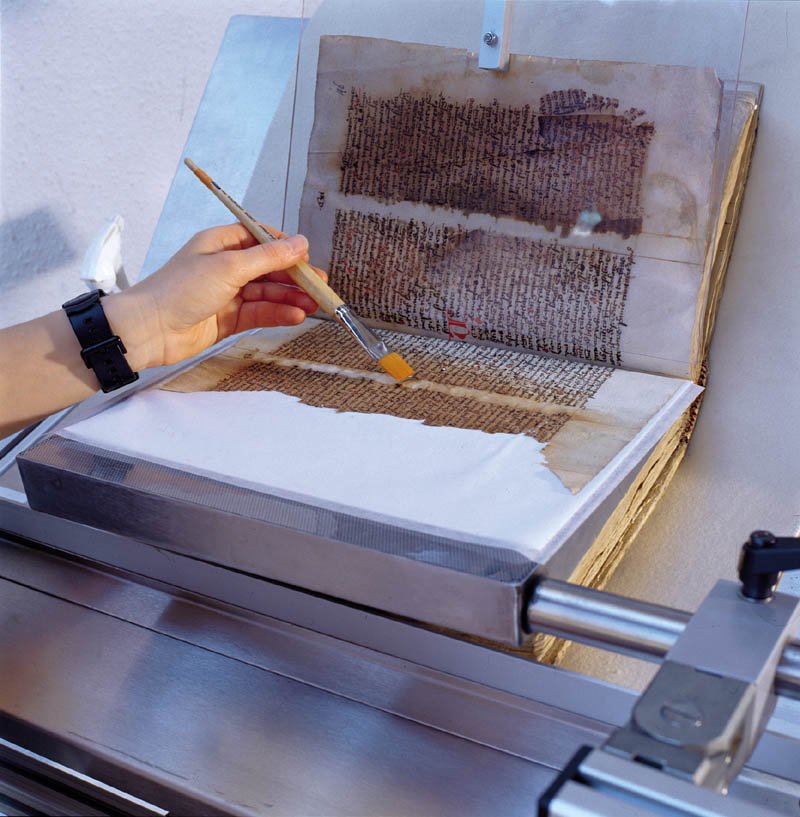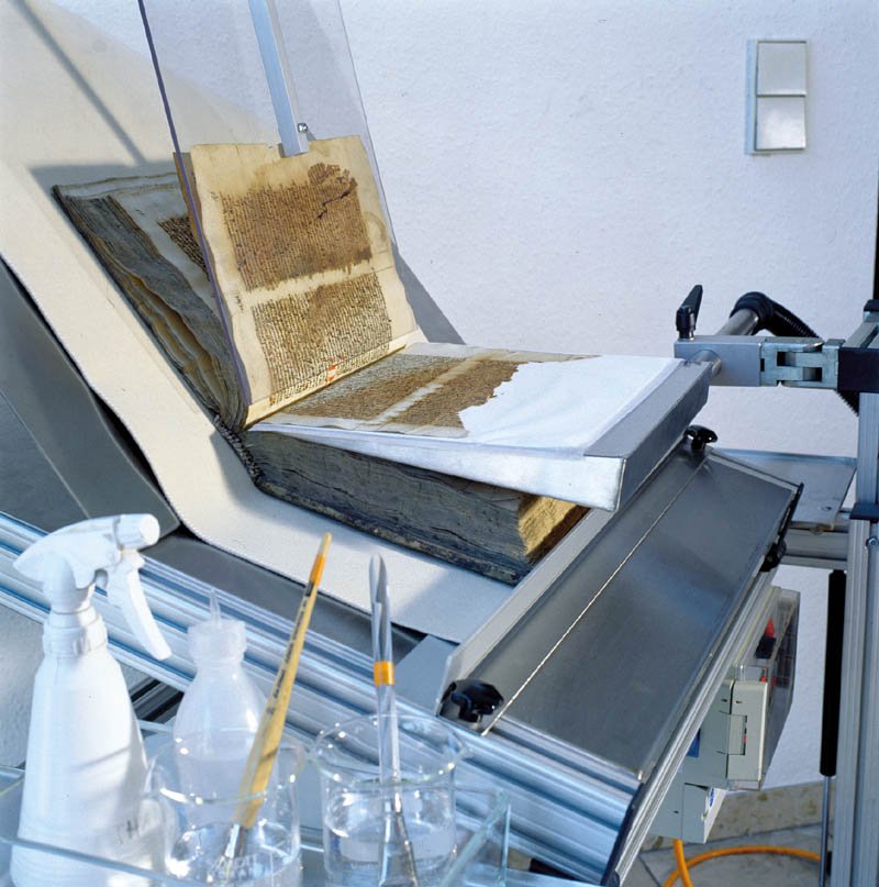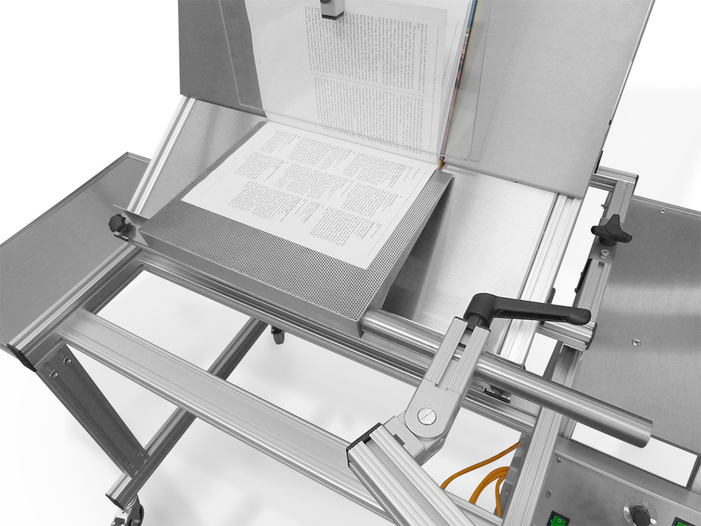 Der in Form eines Keiles gestaltete Unterdrucktisch kann problemlos zur Behandlung von einzelnen Seiten in das gebundene Objekt geschoben werden.