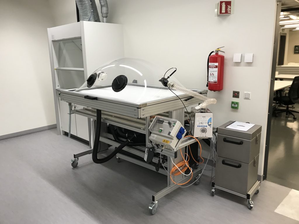 Komplett mit Untergestell und feststellbaren Rollen, stufenlos regulierbare Beleuchtung zum Arbeiten im Durchlicht, Regeleinheit für Unterdruckerzeuger mit stufenloser Drehzahlregulierung zur Feineinstellung des Unterdrucks. Regeleinheit mit zusätzlichen Steckdosen für Fremdverbraucher.