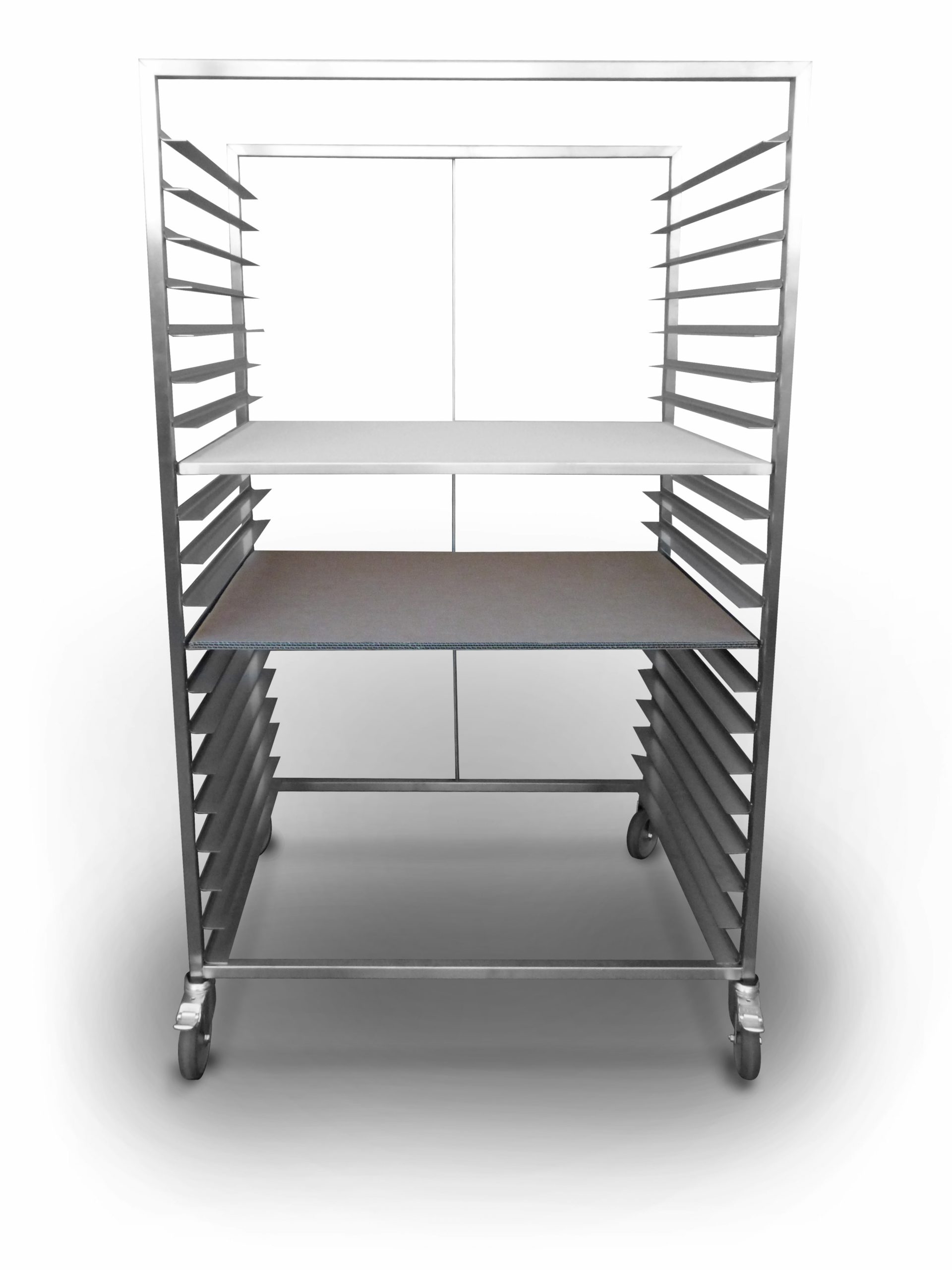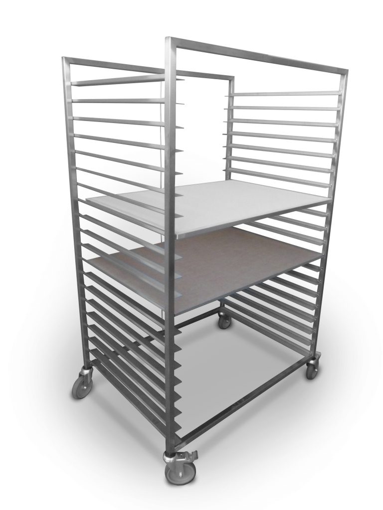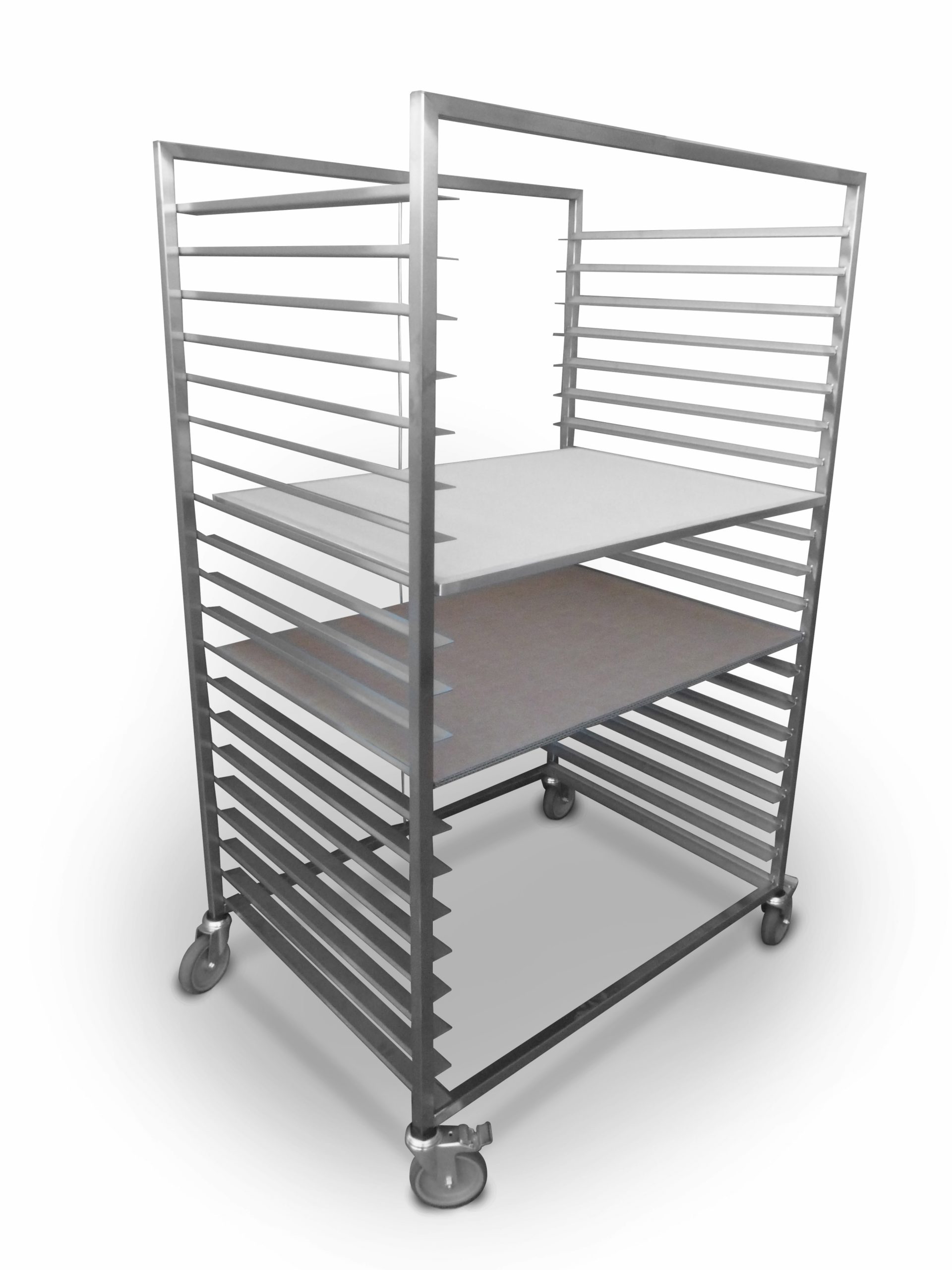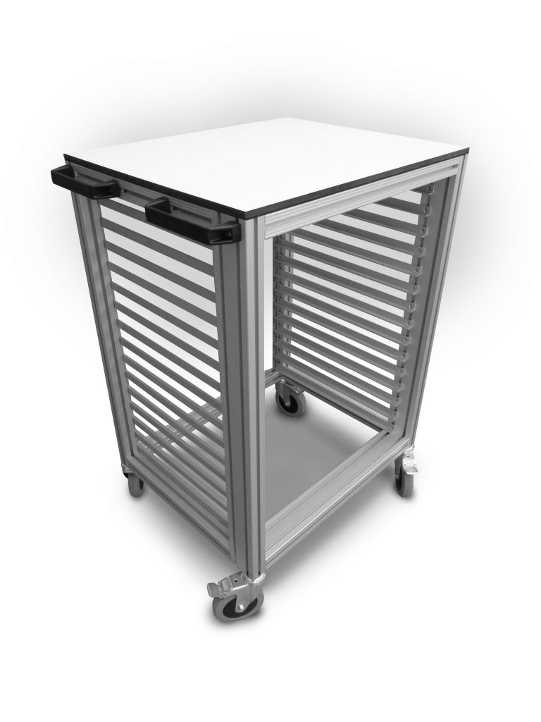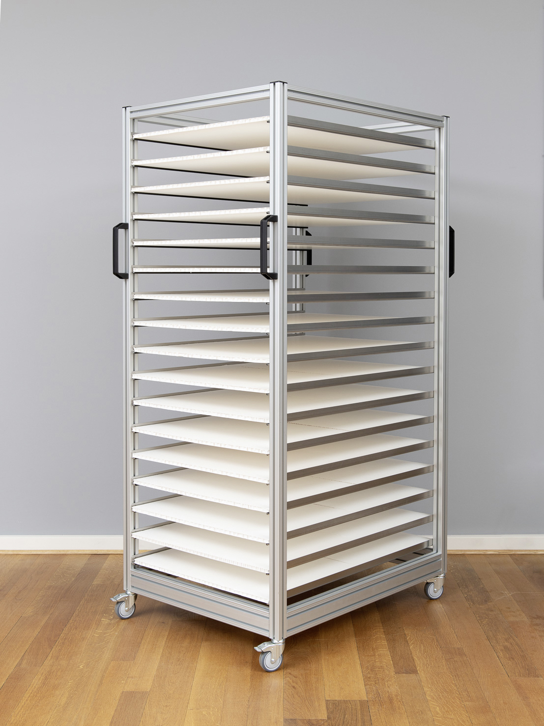 Ablagegestell in Aluminium Ausführung. Bestückbar mit Siebrahmen. Abstände zwischen den Einschüben frei einstellbar.