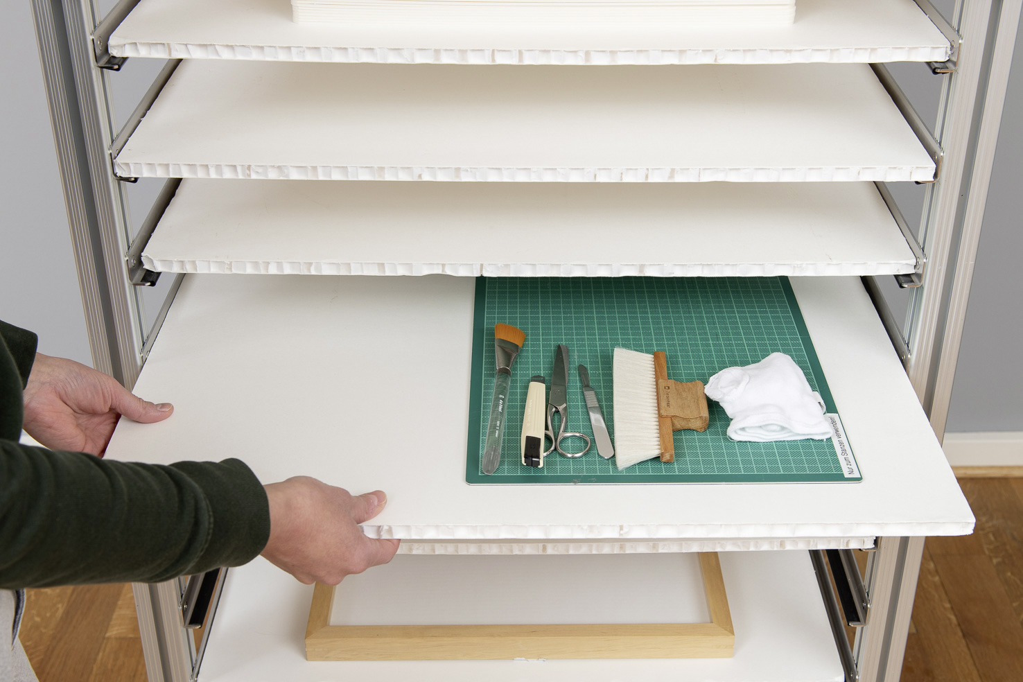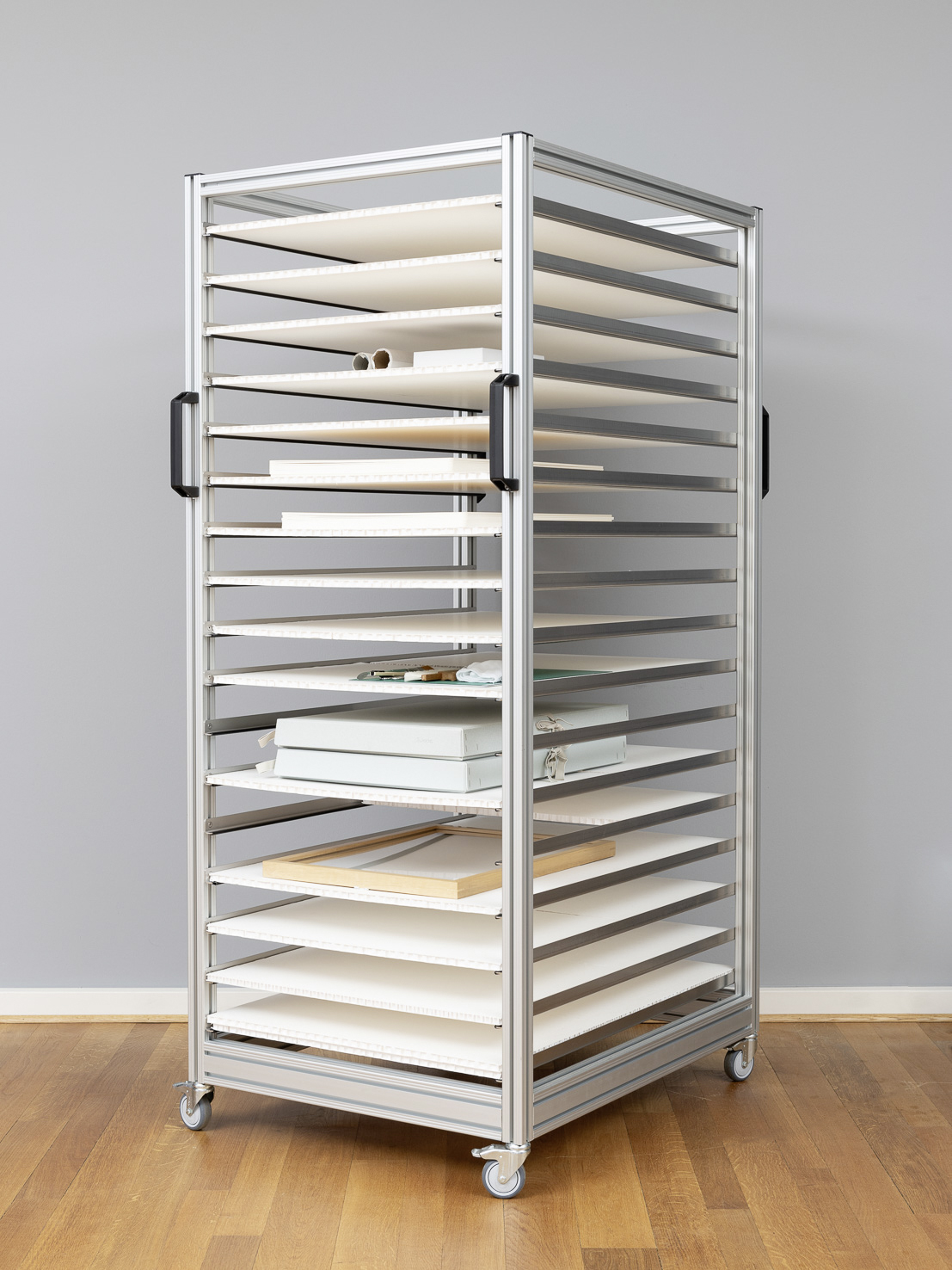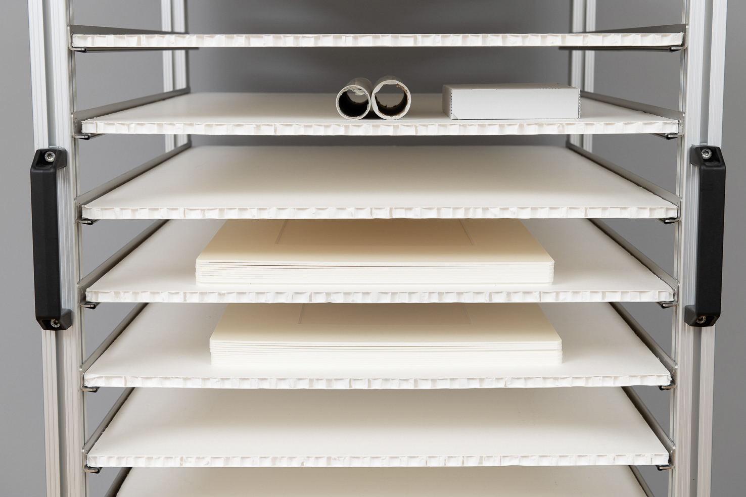 Gestell optional mit Einschüben aus Wabenkernplatte aus säurefreiem Karton.